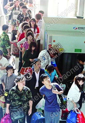 10月8日,眾多游客有序通過(guò)蘇州火車(chē)站的安檢口進(jìn)入候車(chē)大廳。 記者 杭興微攝