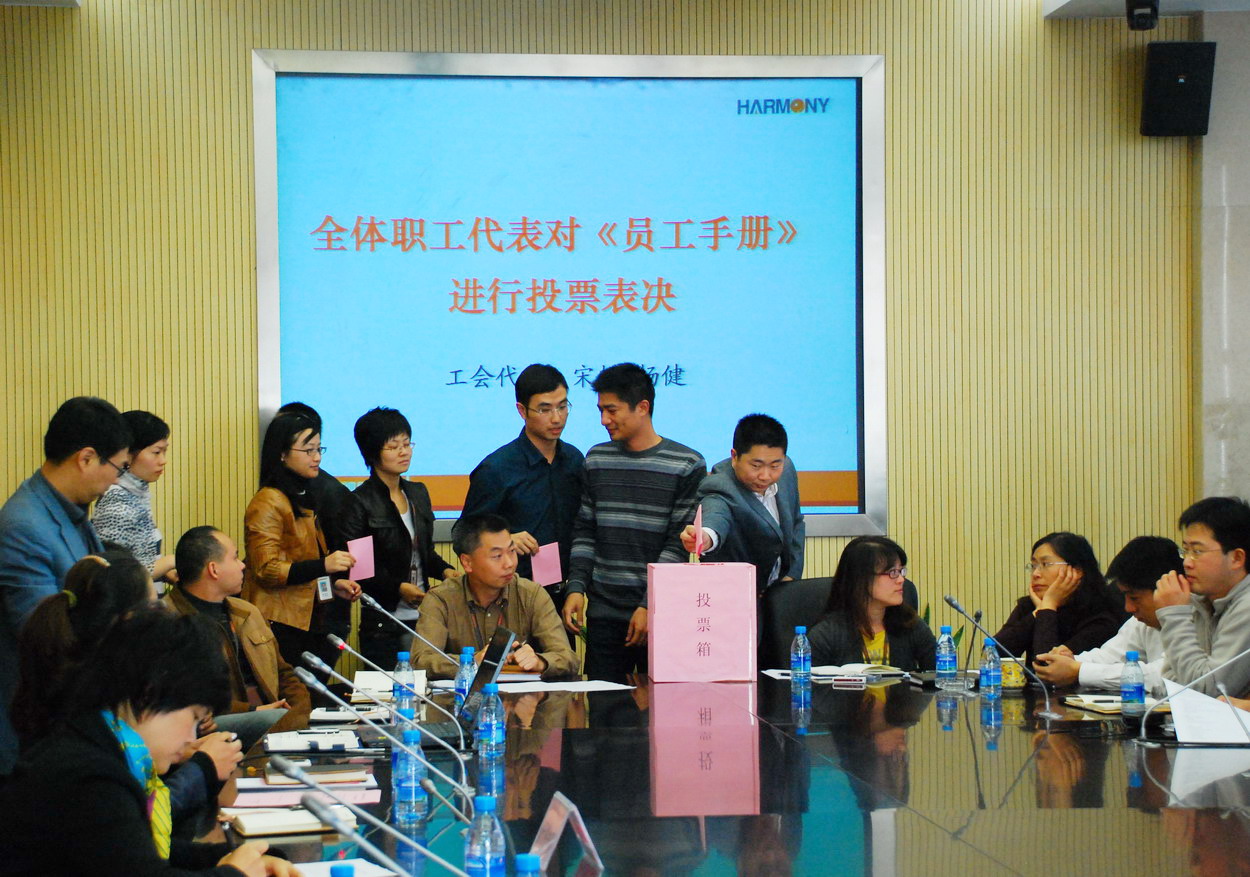 會(huì )議審議聽(tīng)取了集團人力資源部總經(jīng)理李偉做的《員工手冊》編制情況匯報;工會(huì )與人力資源部門(mén)共同協(xié)作,預先提交全體職工代表《員工手冊》稿件、主動(dòng)與職工代表溝通協(xié)商、收集意見(jiàn)建議并組織集體討論等形式,對《員工手冊》進(jìn)行了廣泛而深入的審議,并由工會(huì )委員會(huì )總結了全體職工代表的意見(jiàn),提交人力資源部協(xié)商予以修改完善;最后,全體職工代表通過(guò)無(wú)記名投票的方式,高票通過(guò)《員工手冊》。