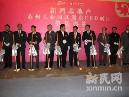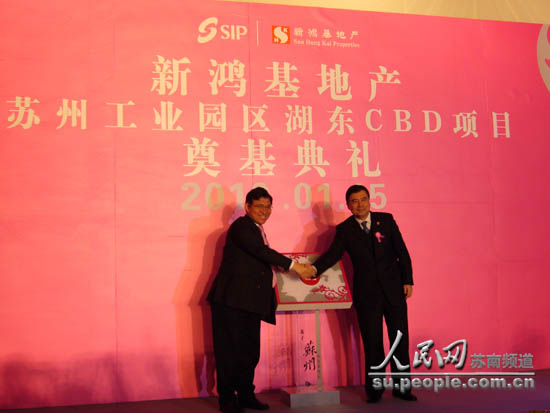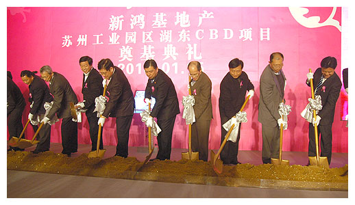 香港最大地產(chǎn)發(fā)展公司之一——新鴻基地產(chǎn)于1月15日舉行蘇州工業(yè)園區湖東CBD項目的奠基典禮。項目包括一座高310米的蘇州“第一高樓”、裙樓及花園廣場(chǎng),將建設成集甲級辦公樓、頂級購物中心和高端服務(wù)式公寓于一體的大型綜合商業(yè)項目。蘇州市委副書(shū)記、市長(cháng)閻立,市領(lǐng)導程惠明、周人言、陶孫賢以及園區工委副書(shū)記、管委會(huì )主任楊知評,新鴻基地產(chǎn)副主席兼董事總經(jīng)理郭炳聯(lián)等嘉賓出席儀式。