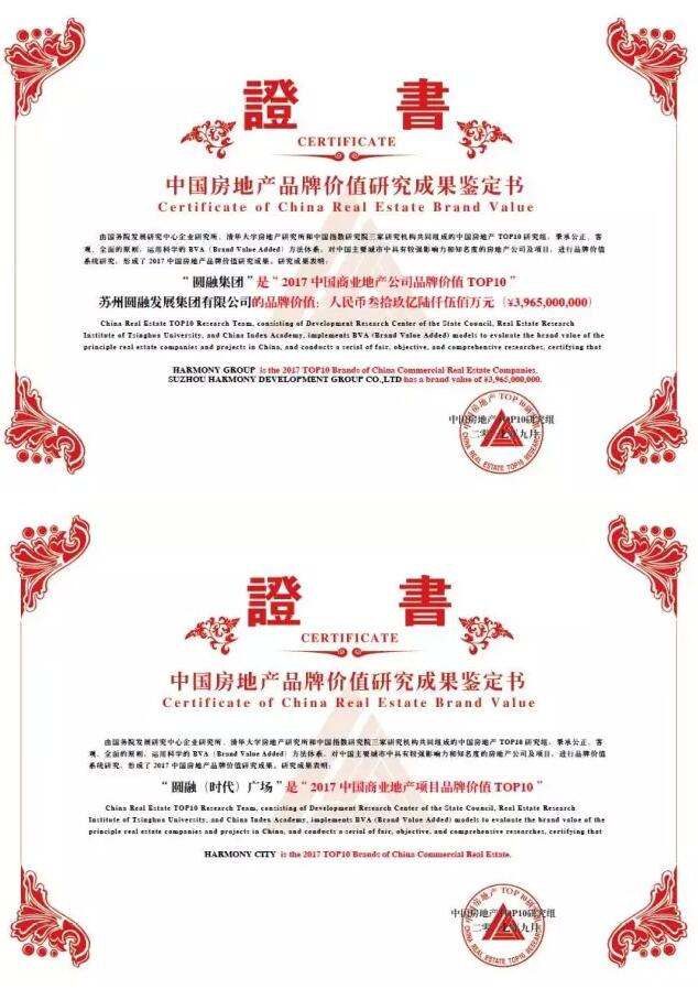2017年9月14日,“2017中國房地產(chǎn)品牌價(jià)值研究成果發(fā)布會(huì )”在北京雁棲湖國際會(huì )議中心隆重召開(kāi)。本次發(fā)布會(huì )由國務(wù)院發(fā)展研究中心企業(yè)研究所、清華大學(xué)房地產(chǎn)研究所和中國指數研究院三家研究機構共同主辦。在本次發(fā)布會(huì )上,蘇州圓融發(fā)展集團有限公司榮膺“2017中國商業(yè)地產(chǎn)公司品牌價(jià)值TOP10”稱(chēng)號。由圓融集團開(kāi)發(fā)的圓融(時(shí)代)廣場(chǎng)榮獲“2017中國商業(yè)地產(chǎn)項目品牌價(jià)值TOP10”稱(chēng)號。