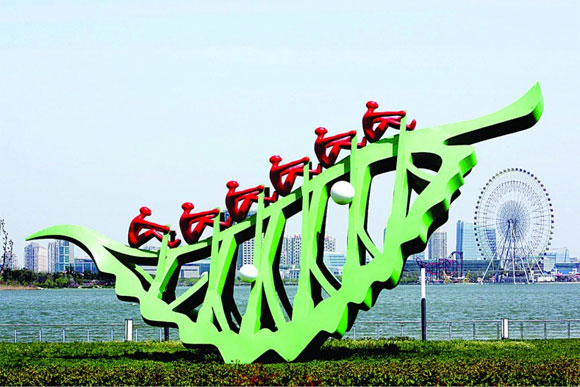 沿著(zhù)水岸、向西拐入金雞湖大道,寬闊的道路筆直通暢。金雞湖南側的望湖角上,顏色鮮艷的雕塑指引著(zhù)新一段賽程,齊心劃船、乘風(fēng)破浪的景象代表著(zhù)力與美的碰撞。富有生態(tài)教育內涵的望湖角公園一邊湖光瀲滟,一邊綠草無(wú)際,靜靜等候著(zhù)途經(jīng)的參賽者們發(fā)現游目騁懷的驚喜。