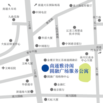 南通雅詩(shī)閣圓融廣場(chǎng)服務(wù)公寓位于南通崇川區核心商圈內,臨近濠河風(fēng)景區。地理位置得天獨厚、交通便利,從公寓步行即可到達圓融購物中心廣場(chǎng)和特色文化商業(yè)步行街——九曲花街,同時(shí)周邊圍繞著(zhù)各類(lèi)金融機構、行政購物中心,滿(mǎn)足住客的生活、工作和娛樂(lè )所需。