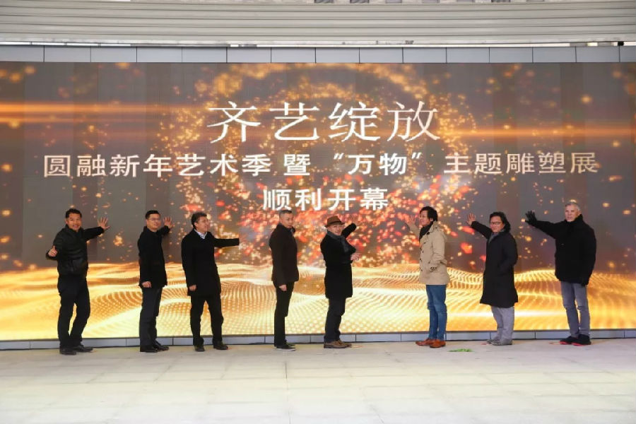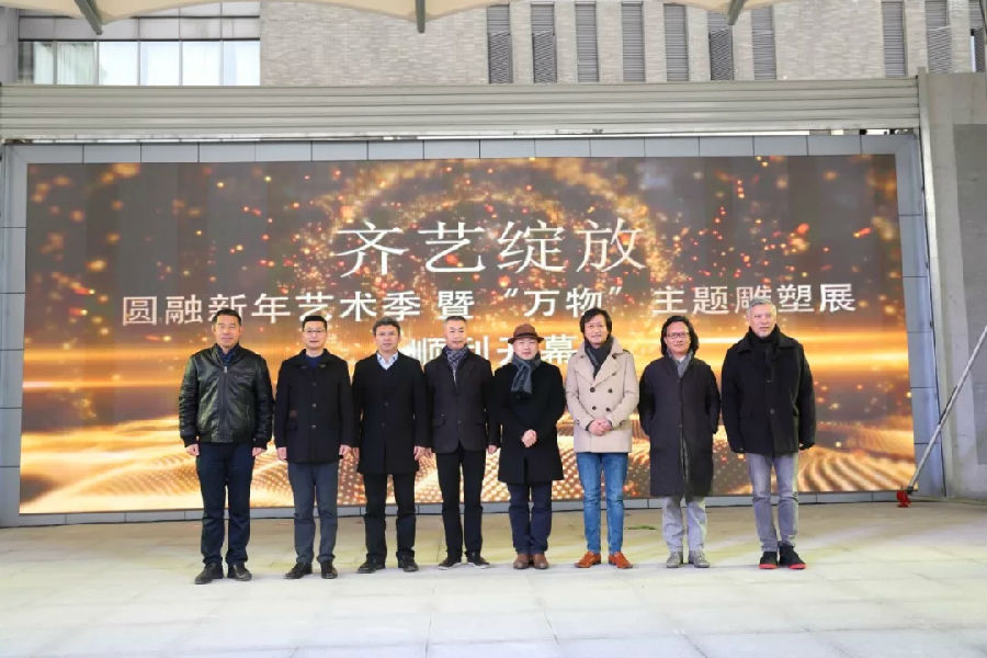 隨后中國雕塑院副院長(cháng)郅敏,中國美術(shù)家協(xié)會(huì )壁畫(huà)藝術(shù)委員會(huì )秘書(shū)長(cháng)齊喆,著(zhù)名評論家、上海大學(xué)美術(shù)學(xué)院教授李曉峰,蘇州市美術(shù)家協(xié)會(huì )副主席黃海,圓融集團副總裁沈玉林,圓融集團副總裁張立剛,圓融藝術(shù)中心主任薛文崗,明美術(shù)館館長(cháng)楊輝一同上臺點(diǎn)亮大屏幕,“齊藝綻放”圓融新年藝術(shù)季暨“萬(wàn)物”主題雕塑展正式開(kāi)啟。