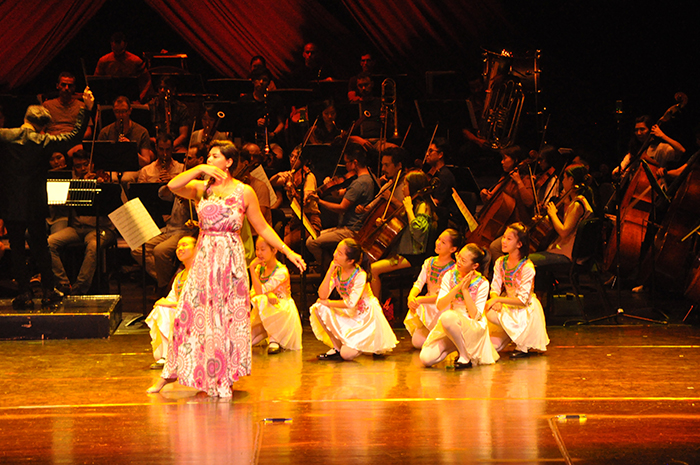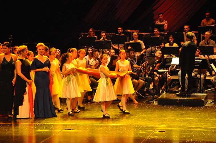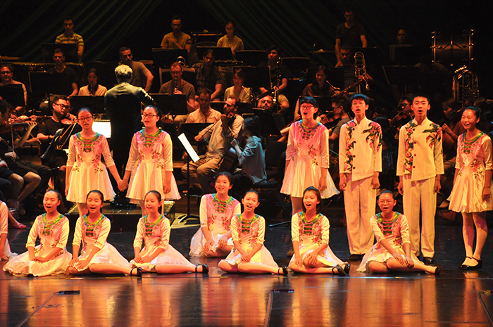 “月亮在白蓮花般的云朵里穿行,晚風(fēng)吹來(lái)一陣陣快樂(lè )的歌聲??”伴隨著(zhù)孩子們空靈、清澈的歌聲與天真爛漫的微笑,整場(chǎng)演出由藝術(shù)團合唱曲目《聽(tīng)媽媽講那過(guò)去的事情》、《讓我們蕩起雙槳》拉開(kāi)帷幕。孩子們不僅演唱了歌曲,還參與了其他外國歌唱家演唱的伴舞,受到了現場(chǎng)觀(guān)眾的熱烈歡迎。孩子們的參與讓節目更加靈動(dòng)多彩。