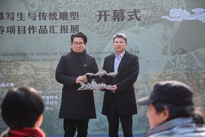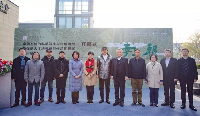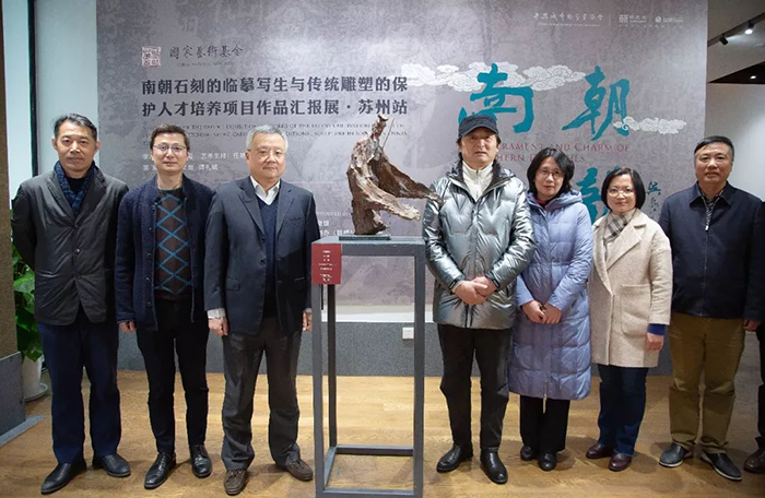 南京大學(xué)雕塑藝術(shù)研究所李巖將石刻作《月下松濤醉——陶淵明》贈與圓融藝術(shù)中心永久珍藏。最后,由在場(chǎng)領(lǐng)導和藝術(shù)家共同剪彩,見(jiàn)證“南朝氣韻——南朝石刻的臨摹寫(xiě)生與傳統雕塑的保護人才培養項目作品匯報展·蘇州站”正式拉開(kāi)帷幕。