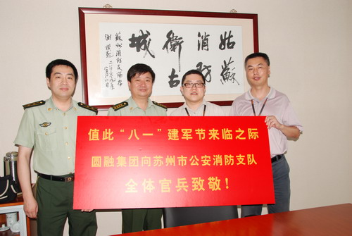 2010年7月30日上午,在八一建軍節來(lái)臨前夕,圓融集團副總裁曹翔、總裁助理沈玉林等一行走訪(fǎng)慰問(wèn)了蘇州市公安消防支隊,代表集團向消防支隊全體官兵致以節日的問(wèn)候。