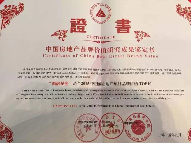 2015中國房地產(chǎn)品牌價(jià)值研究成果發(fā)布會(huì )上,新建元控股旗下圓融集團自2011以來(lái)第五次榮膺“中國商業(yè)地產(chǎn)公司品牌價(jià)值TOP10”稱(chēng)號,品牌價(jià)值高達人民幣貳拾伍億柒仟捌佰萬(wàn)元(¥2,578,000,000.00)其開(kāi)發(fā)的圓融星座項目首次榮獲“2015中國商業(yè)地產(chǎn)項目品牌價(jià)值TOP10”稱(chēng)號。