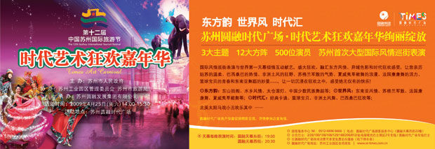 2009年4月25日,作為第12屆蘇州國際旅游節點(diǎn)睛活動(dòng)之一的“時(shí)代狂歡藝術(shù)嘉年華”在圓融時(shí)代廣場(chǎng)隆重舉行,來(lái)自境內外和蘇州各界專(zhuān)業(yè)演出團體舉行了精彩的歌舞表演和狂歡活動(dòng)?;顒?dòng)從下午2點(diǎn)開(kāi)始,持續了近兩個(gè)小時(shí),吸引了來(lái)自蘇州以及周邊地區的5萬(wàn)多名觀(guān)眾到現場(chǎng)觀(guān)看表演?!凹文耆A”活動(dòng)充分展示了園區旅游現代時(shí)尚的特點(diǎn),也充分展現了蘇州旅游古韻今風(fēng)、中西合璧的魅力,集聚了人氣商氣,繁榮了圓融時(shí)代廣場(chǎng),打響了園區旅游品牌。